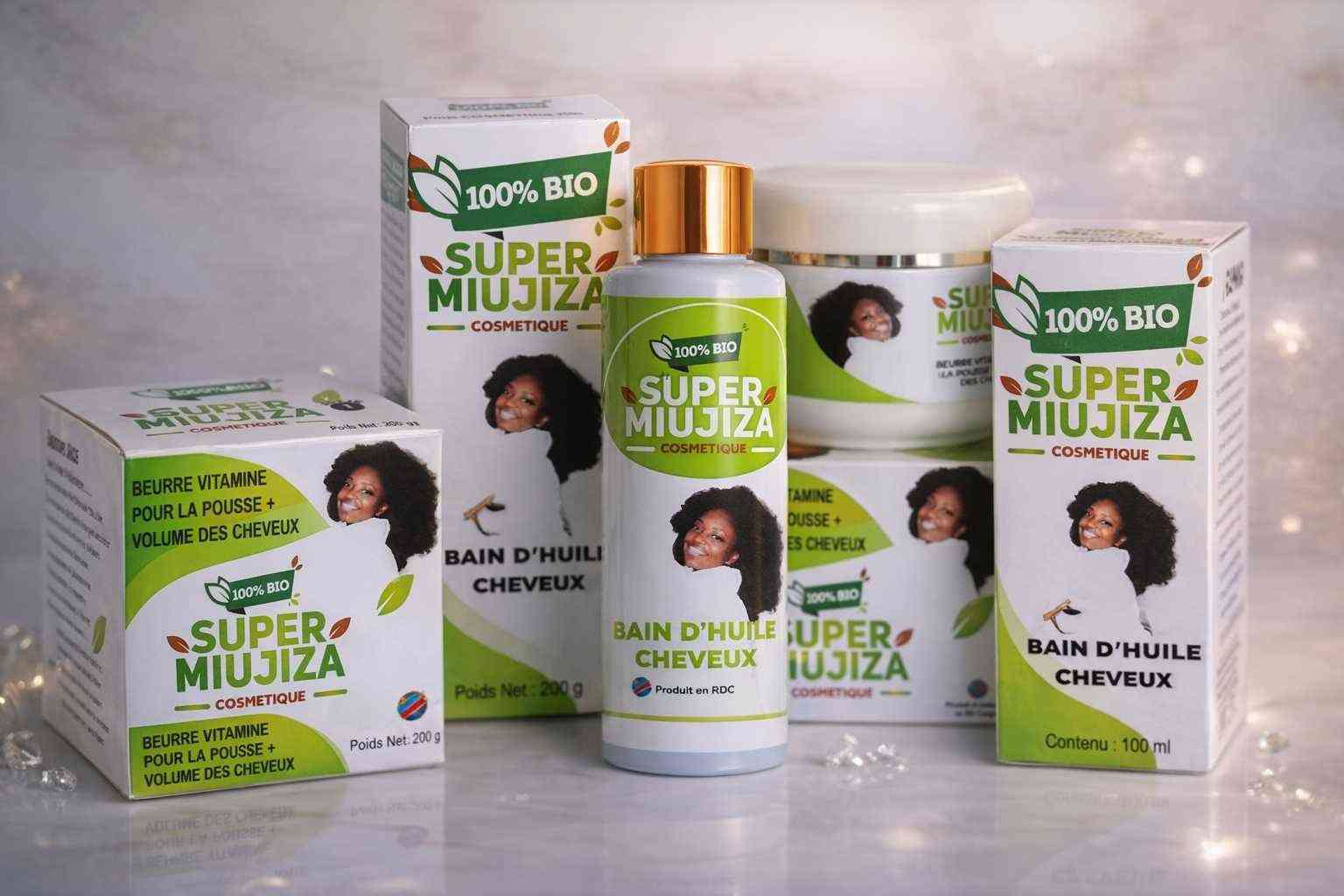 SUPER MIUJIZA COSMÉTIQUE NATUREL – Usage capillaire Le Beurre vitaminé et Bain d’huile Super Miujiza est un soin capillaire naturel formulé pour favoriser la pousse, renforcer le volume et améliorer la santé globale des cheveux. Il est spécialement conçu pour nourrir, protéger et faciliter le démêlage, tout en respectant tous les types de cheveux, en particulier les cheveux secs et abîmés. Notre produit se vend en gamme (Beurre vitaminé & Bain d'huile à 30$)